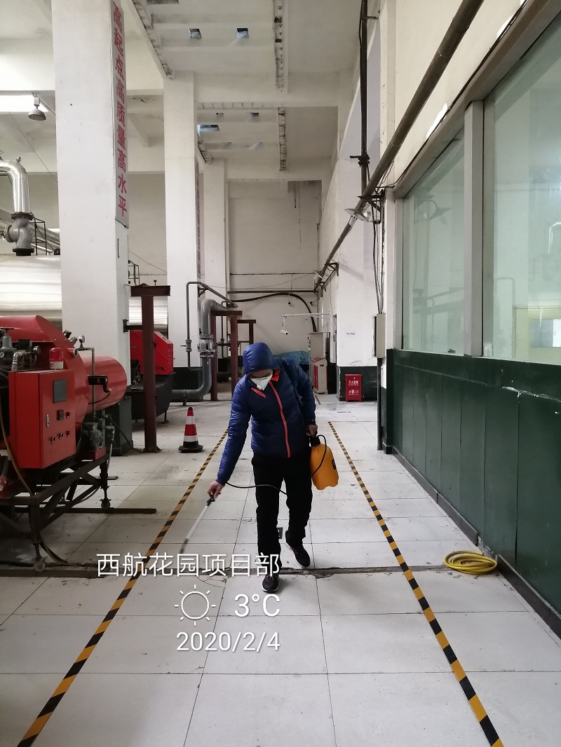 帶班領導為員工示范配制、噴灑消毒液,指導員工對鍋爐房、維修班、調度室等進行全面消毒。
