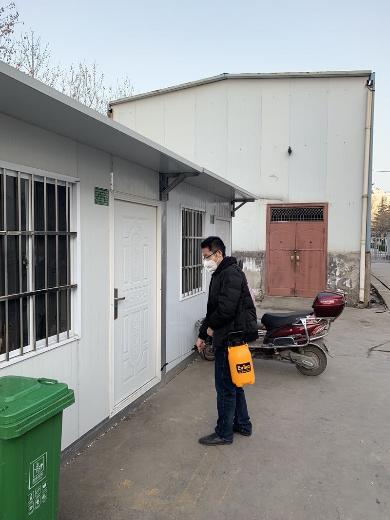 西航花園項目用緊急配發的84消毒水和酒精每日對辦公場所、操作場所、宿舍全區域進行3次消毒工作。