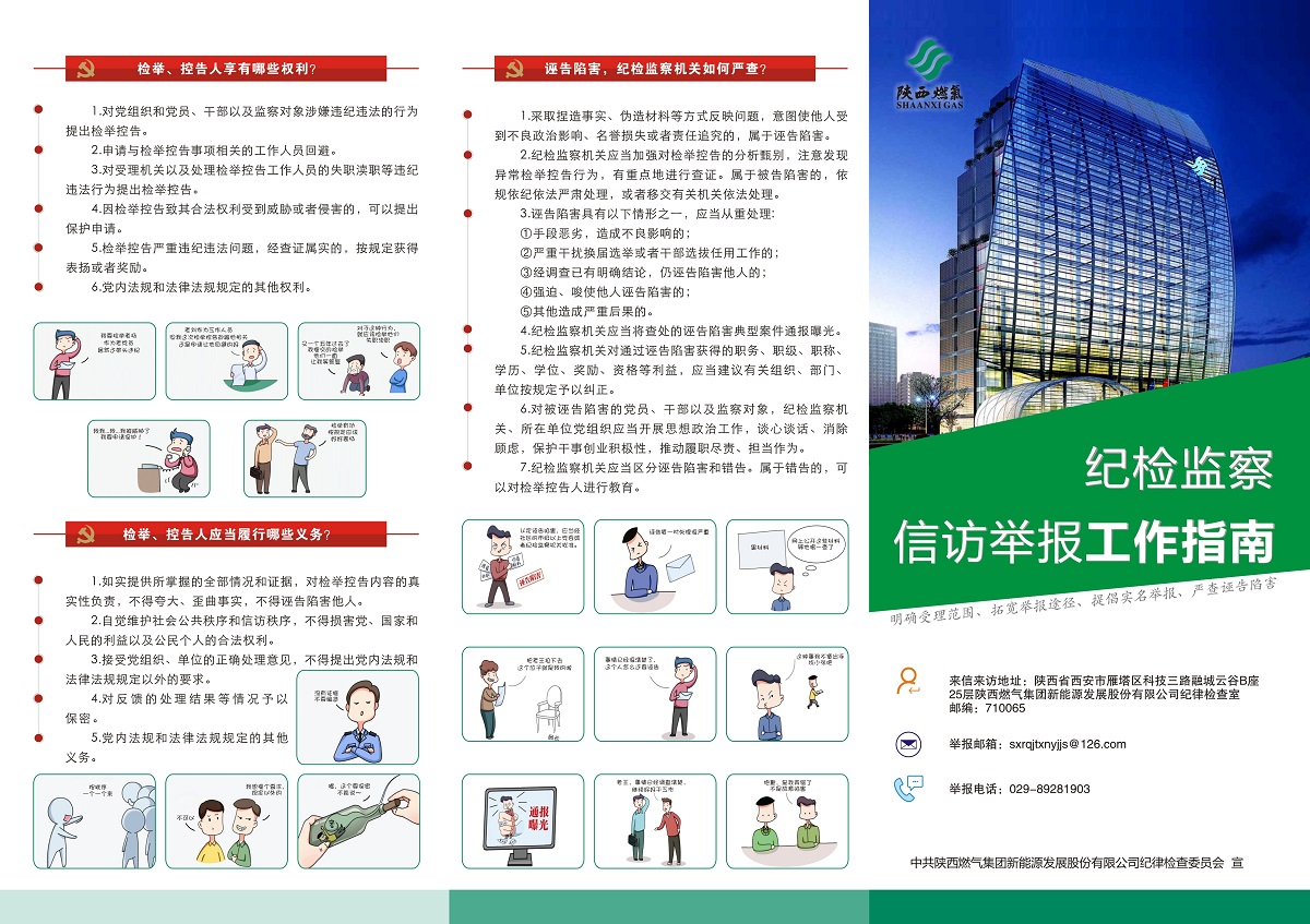 《紀檢監察信訪舉報工作指南》宣傳冊以《紀檢監察機關處理檢舉控告工作規則》為指導,涵蓋“紀檢監察機關及其工作人員怎么處理檢舉控告工作”、“哪些行為可以向紀檢監察機關檢舉控告”、“檢舉、控告人享有哪些權利”以及新能源公司信訪舉報方式等內容,配以漫畫加以解釋,淺顯易懂,有利于提高紀檢監察信訪舉報在群眾中的知曉率,引導廣大職工群眾正確行使檢舉控告權利。