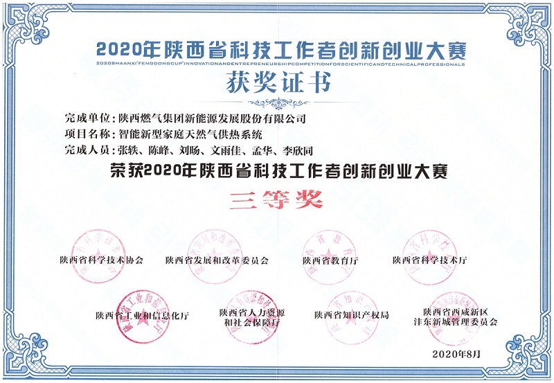 陜西燃?xì)饧瘓F(tuán)新能源發(fā)展股份有限公司榮獲2020年“灃東杯”陜西省科技工作者創(chuàng)新創(chuàng)業(yè)大賽三等獎(jiǎng)