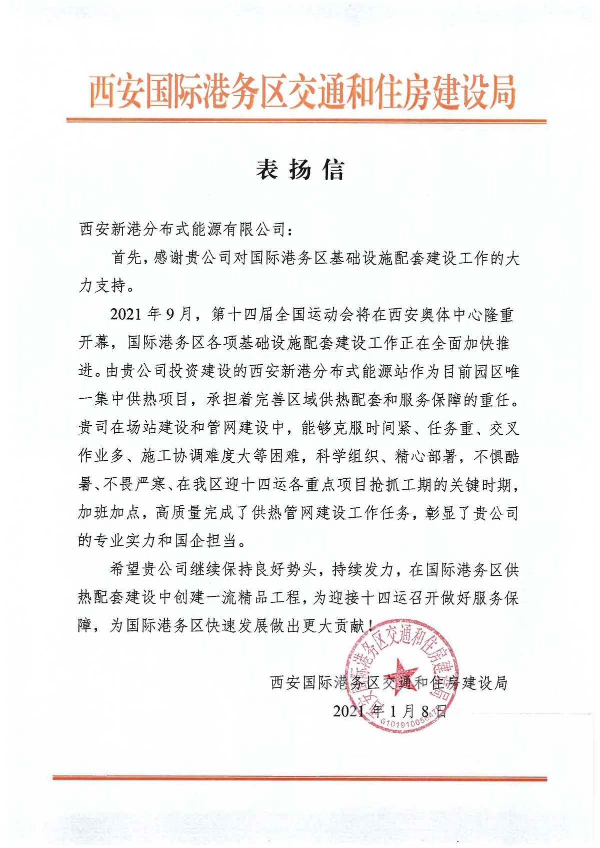 近日,港務(wù)區(qū)交通和住房建設(shè)局向新港公司發(fā)來表揚(yáng)信,高度贊揚(yáng)了公司在2020年場站建設(shè)和管網(wǎng)建設(shè)中取得的成績,充分肯定了公司的專業(yè)實力和國企擔(dān)當(dāng)精神。